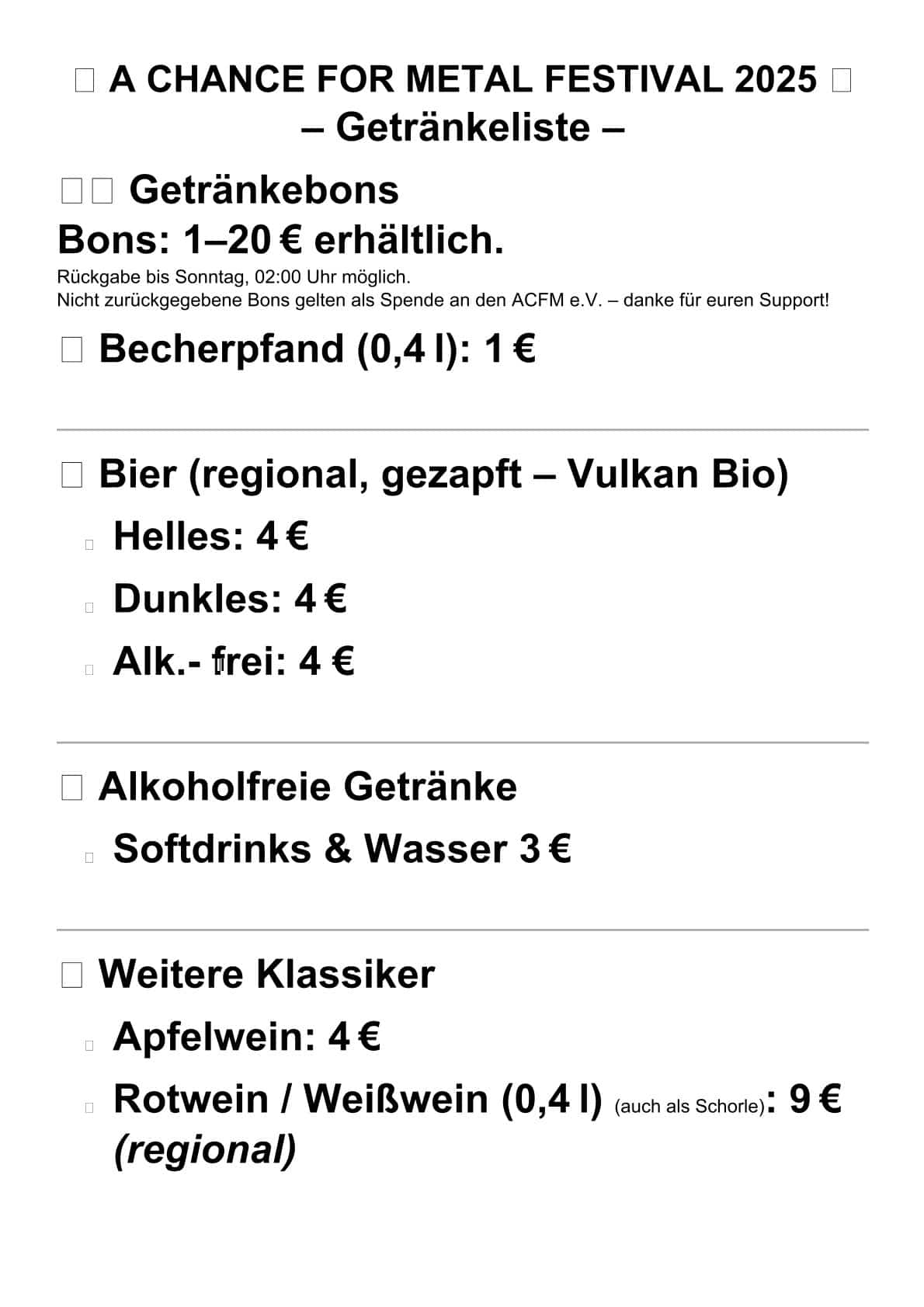 GETRÄNKEBONS: Es ist keine Kartenzahlung auf dem ACFMF möglich. Um Getränke zu kaufen, braucht ihr eine Getränkebonkarte. Diese gibt es am ACFM- Infopunkt in Höhe von 1- 20€. Eine Rückgabe der Karten ist bis Sonntag 02:00 Uhr möglich. (Alles andere wird als ACFM e.V.- Spende verstanden.)