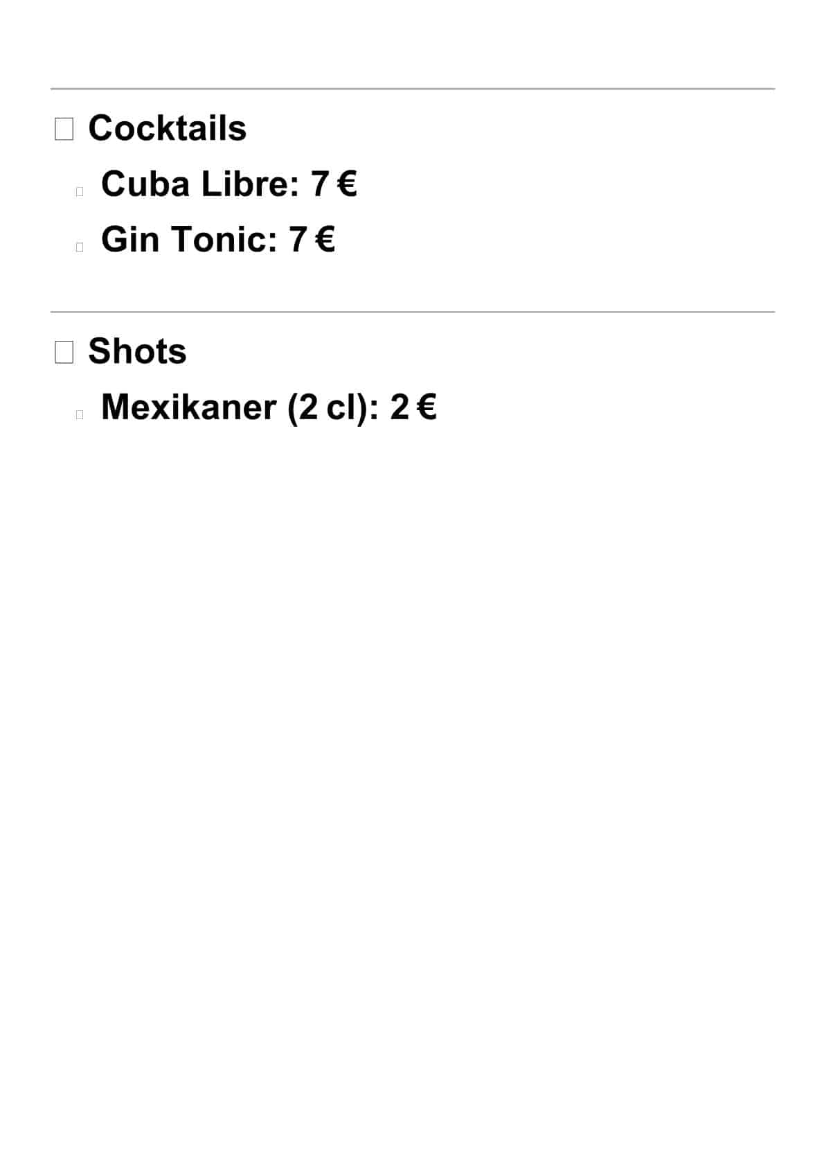 Planmäßig: Vulkan Bio- hell & Bio- dunkel (regional/ gezapft), Softdrinks, Wasser, Apfelwein, Weißweinschorle (regional), Rotwein (regional), Cocktail- Cuba Libre, Cocktails- Gin, Tonic, Mexikaner- Shot (2cl).